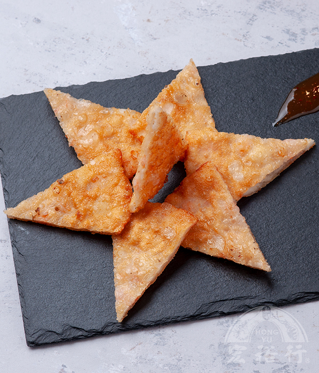 使用高檔蝦仁搭配澎湖花枝,在以不同手法呈現,創造出最具有異國風味產品。外皮利用糯米紙包覆住,使酥脆感較為顯著,內餡搭配鮮甜花枝和鮮脆蝦仁,口感香脆,清爽   不油膩。
